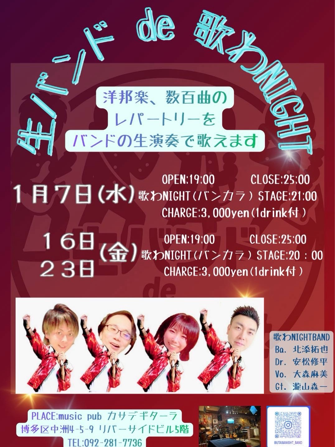 カサデギターラへようこそ! 「カサデギターラ(Casa de Guitarra)」は、 博多区中洲に根ざして長年、 音楽ファンに愛されてきたライブバーです。 私たちは、お客様自身がステージに立ち、音楽セッションに 参加できる、開かれた「音楽の家」をギター初心者から ベテランまで、すべての方に楽しい音楽体験をお届けします。 YOUTUBEチャンネル 49周年LIVE 2026/2/7(土)8(日) ![]() ![]() ![]() ![]() 2025.7.15 MUSIC FELLOWS LIVE ![]() LIVE YOUTUBE 生バンド de 歌わNIGHT 洋邦楽、数百曲のレパートリーを バンドの生演奏で歌えます。 JAM & COOKIN ROCK,JAZZ,POPSフリーセッション 美味しい料理 オールディーズデイ 第2土曜日開催 オールディーズ好き集まれ チャージ2,500円(ワンドリンク付) 古き良きアメリカ 集いてアメリカングラフィティの世界 ![]() アコギターラ・フェスタ 第3土曜日開催 オープンマイク形式 アコースティックが好きな方の集い チャージ2,500円(ワンドリンク付) 弾き語り、歌うたい大歓迎。 懐かしのフォーク、ここで披露しては? 後でセッションもあるかも! フリー演奏パーティ 第4土曜日開催 お食事つき、飲み放題4,500円女性4,000円 ギター演奏、弾き語り、歌うたい大歓迎。 食べて飲んで歌って演奏して。 バック演奏も致しますので、みんなで楽しもう! カラオケーラ導入 ![]() 演奏の合い間に、 また、歌好きなお連れ様も楽しんでいただけます。 カサデギターラ(PPM)ハウスバンド フロンティアーズ ピーターポールアンドマリーの世界を忠実に再現。 魅惑のハーモニーをお酒と一緒にご堪能ください! ![]() 「野口ギター教室」開催! ギターを弾いてみたい方、もっと上手になりたい方 募集しています!詳細はお店にお尋ねください。 ![]() 出演バンド募集中 歌の好きな方も、是非どうぞ! あの頃の歌、皆んなで歌いましょうね。 |