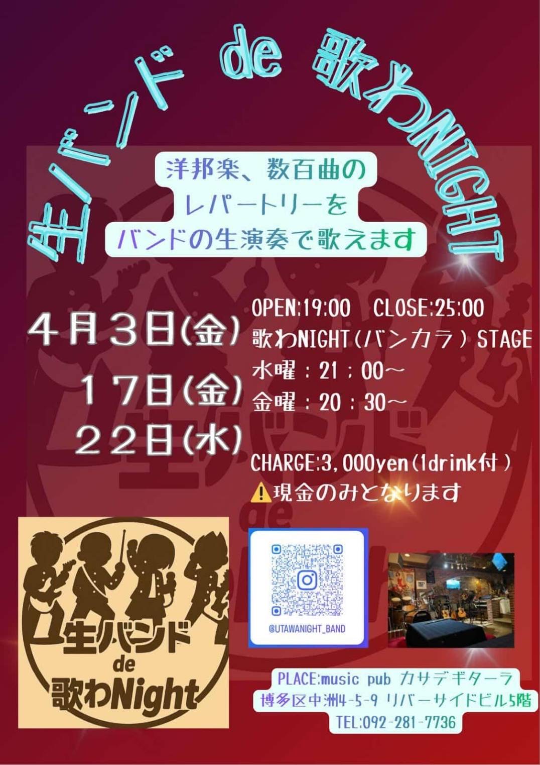 カサデギターラへようこそ! 「カサデギターラ(Casa de Guitarra)」は、 博多区中洲に根ざして長年、 音楽ファンに愛されてきたライブバーです。 私たちは、お客様自身がステージに立ち、音楽セッションに 参加できる、開かれた「音楽の家」で各楽器の初心者から ベテランまで、すべての方に楽しい音楽体験をお届けします。 YOUTUBEチャンネル 49周年LIVE 2026/2/7(土)8(日) ご来場いただき誠にありがとうございました。 次は50周年に向けて頑張ってまいりますので 今後ともよろしくお願い申し上げます。 ![]() 2025.7.15 MUSIC FELLOWS LIVE ![]() LIVE YOUTUBE 生バンド de 歌わNIGHT 洋邦楽、数百曲のレパートリーを 歌わNIGHTバンドの生演奏をバックに歌えます。 JAM & COOKIN ROCK,JAZZ,POPSフリーセッション 美味しい料理 オールディーズデイ 第2土曜日開催 オールディーズ好き集まれ チャージ2,500円(ワンドリンク付) 古き良きアメリカ 集いてアメリカングラフィティの世界 ![]() アコギターラ・フェスタ 第3土曜日開催 オープンマイク形式 アコースティックが好きな方の集い チャージ2,500円(ワンドリンク付) 弾き語り、歌うたい大歓迎。 懐かしのフォーク、ここで披露しては? 後でセッションもあるかも! フリー演奏パーティ 第4土曜日開催 お食事つき、飲み放題4,500円女性4,000円 ギター演奏、弾き語り、歌うたい大歓迎。 食べて飲んで歌って演奏して。 バック演奏も致しますので、みんなで楽しもう! カラオケーラ導入 ![]() 演奏の合い間に、 また、歌好きなお連れ様も楽しんでいただけます。 カサデギターラ(PPM)ハウスバンド フロンティアーズ ピーターポールアンドマリーの世界を忠実に再現。 魅惑のハーモニーをお酒と一緒にご堪能ください! ![]() 「野口ギター教室」開催! ギターを弾いてみたい方、もっと上手になりたい方 募集しています!詳細はお店にお尋ねください。 ![]() 出演バンド募集中 歌の好きな方も、是非どうぞ! あの頃の歌、皆んなで歌いましょうね。 |